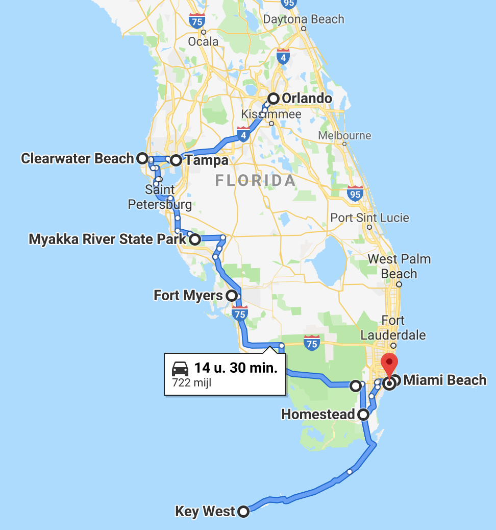 De steden/gebieden Orlando, Tampa, Clearwater Beach, Myakka River State Park, Fort Myers, Everglades, Homestead, Key West, Miami Beach en Miami gaan wij langs.