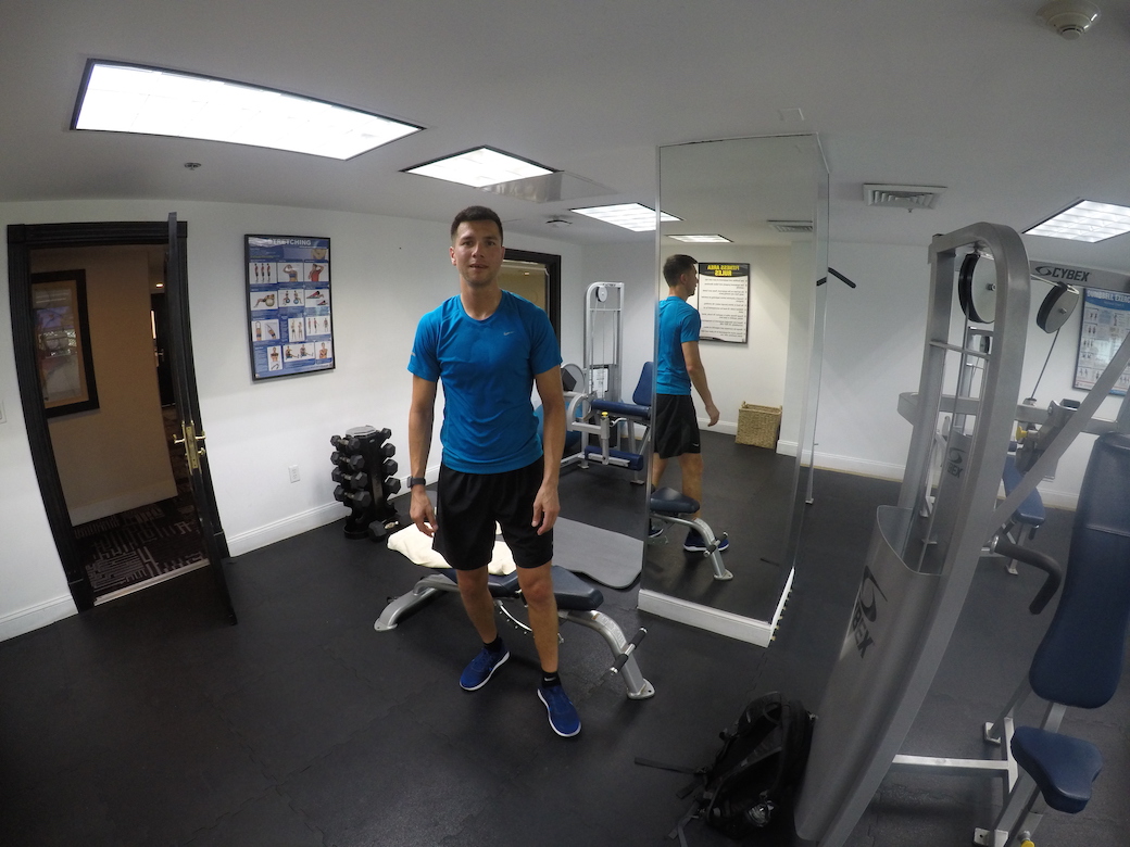 Toen we hadden ontbeten was het tijd voor een uurtje sporten. De fitnessruimte in het hotel was niet bijzonder groot. Er stonden genoeg apparaten en gewichten om onze oefeningen te doen. Een goed begin van de dag.