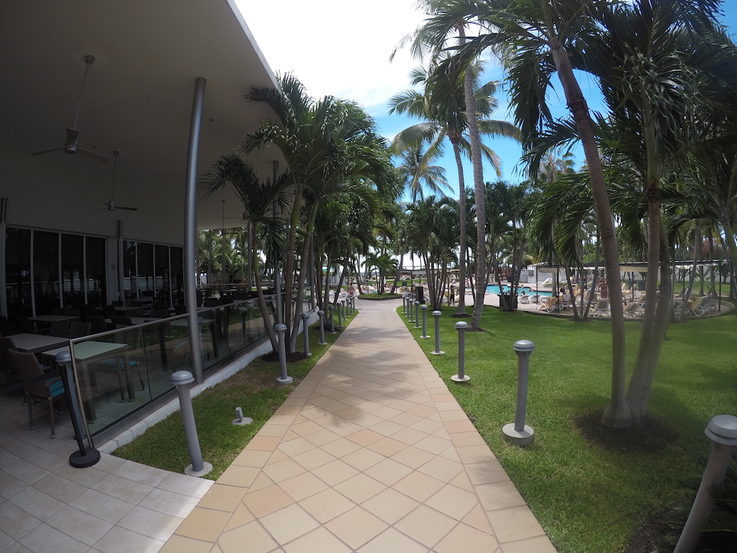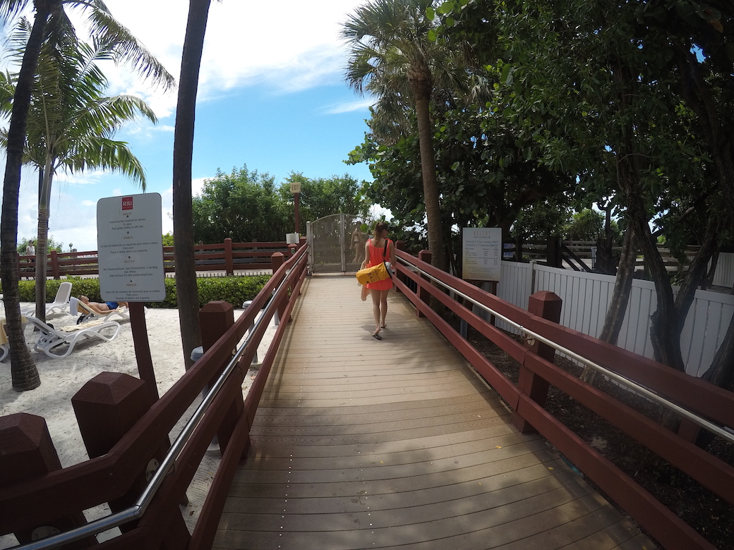 In de middag gingen we naar het strand. Via de hoteluitgang bij het zwembad loop je over de boardwalk direct het strand op. Het is redelijk breed en wit, ziet er allemaal mooi uit. Iets verder, richting de zee, konden we (als gasten van Riu Plaza) gratis gebruik maken van ligbedden en een parasol. Als we het goed zagen heeft elk hotel een stukje met eigen ligbedden en parasols. Tegen betaling kan je het huren, als je bijvoorbeeld niet in een hotel verblijft.