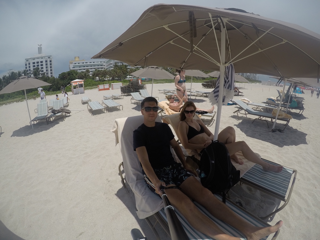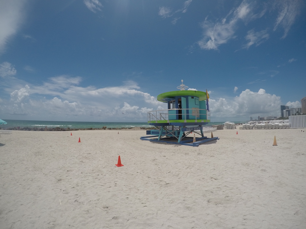Het was hoog tijd geworden voor het strand. Gelukkig was het weer opgeklaard en scheen de zon inmiddels. Op het strand hadden we ligbedden gevonden op een mooie plek. Het is op Miami Beach goed geregeld met de ligbedden, niet te massaal. In de zee was het wederom een aangename temperatuur. We kwamen de middag heerlijk relax door.