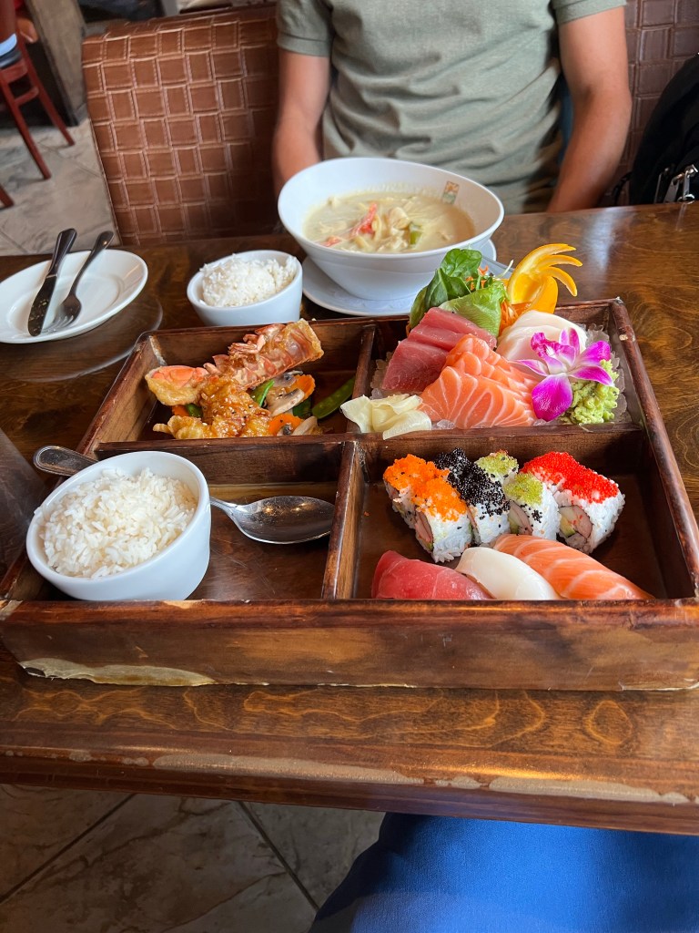 Bij binnenkomst werden wij vriendelijk ontvangen. Reserveren vooraf was niet nodig, dit staat ook op de website vermeld. Zoals de naam van het restaurant al doet vermoeden staan er zowel Japans als Thais op de menukaart. Jacqueline koos voor sushi en Patrick voor Thais.