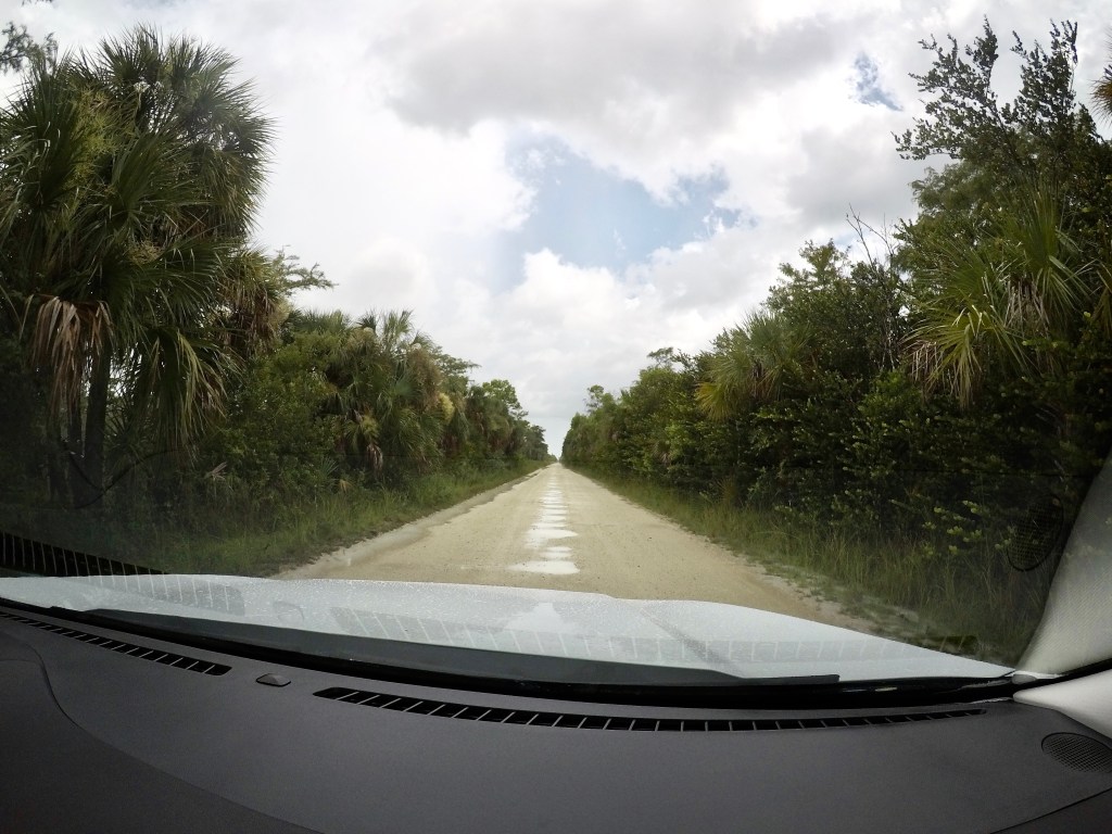 Vervolgens reden wij naar de Looproad. Een lang stuk onverharde weg door de Everglades. Er waren veel kuilen in de weg, op het moment vaak met water van de regen. Het was af en toe heel zachtjes rijden. Naast de weg achter de bomen en planten ligt er water. Bij één van de bruggen zagen wij alligators in het water. Het blijft toch een raar angstig gevoel om ze zo redelijk dichtbij in het wild te zien. Aan andere kant is het ook prachtig om ze zo te zien.