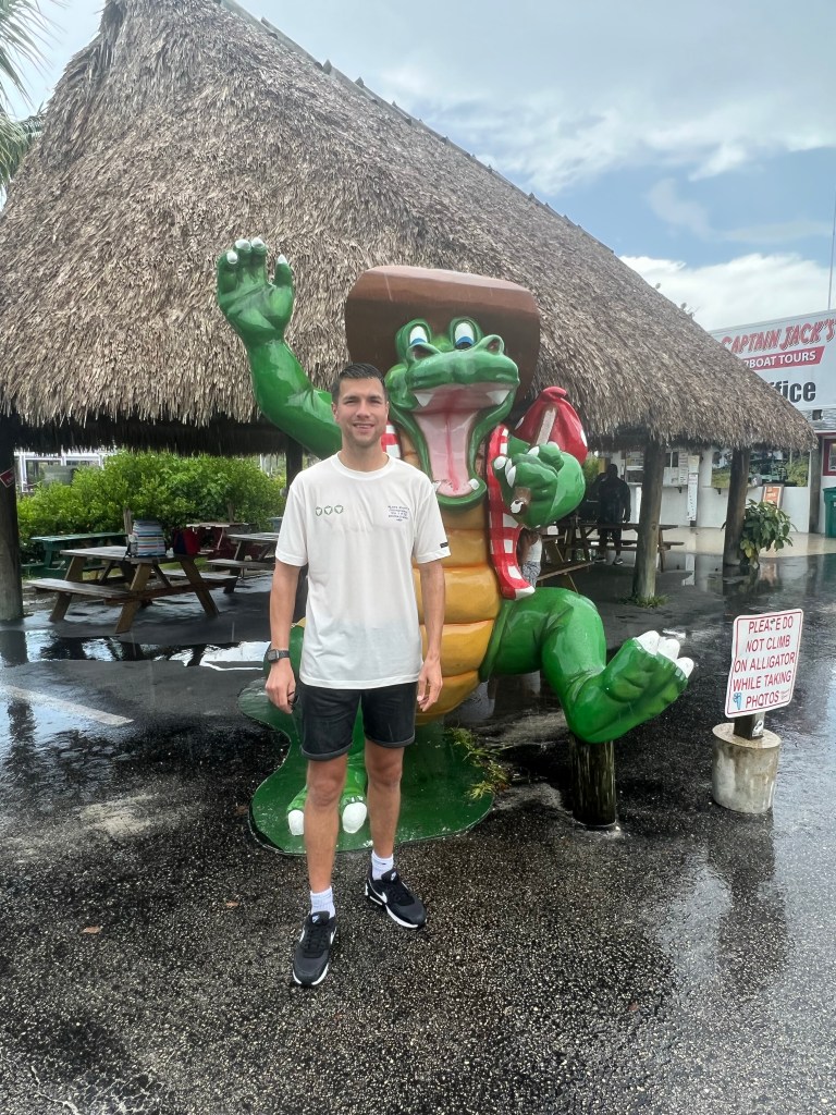 Het eerste stuk werd er nog rustig gevaren maar bij en in de mangroves van de Everglades ging het al iets harder. De man achter het stuur weet waar de alligators zitten en bracht ons op een aantal plekken. En ja hoor wij zagen eerst een kleine beest. Op een andere plek lag er een grotere. Onze captain ging met zijn hand in het water en bewoog hem heen en weer. De alligator kwam hier op af. Hij zwom langs en onder de boot door. Dat was heel mooi om te zien. Na een aantal minuten ging de tocht weer verder. De boot ging nu echt op volle toeren en scheurde door het gebied heen. Onderweg begon het helaas flink te regenen. Bij terugkomst waren wij zeiknat. De tour duurde ruim een half uur en was zeker de moeite waard!